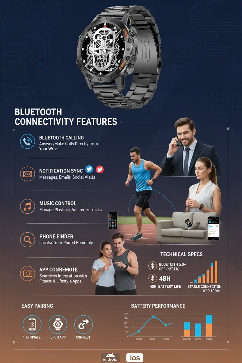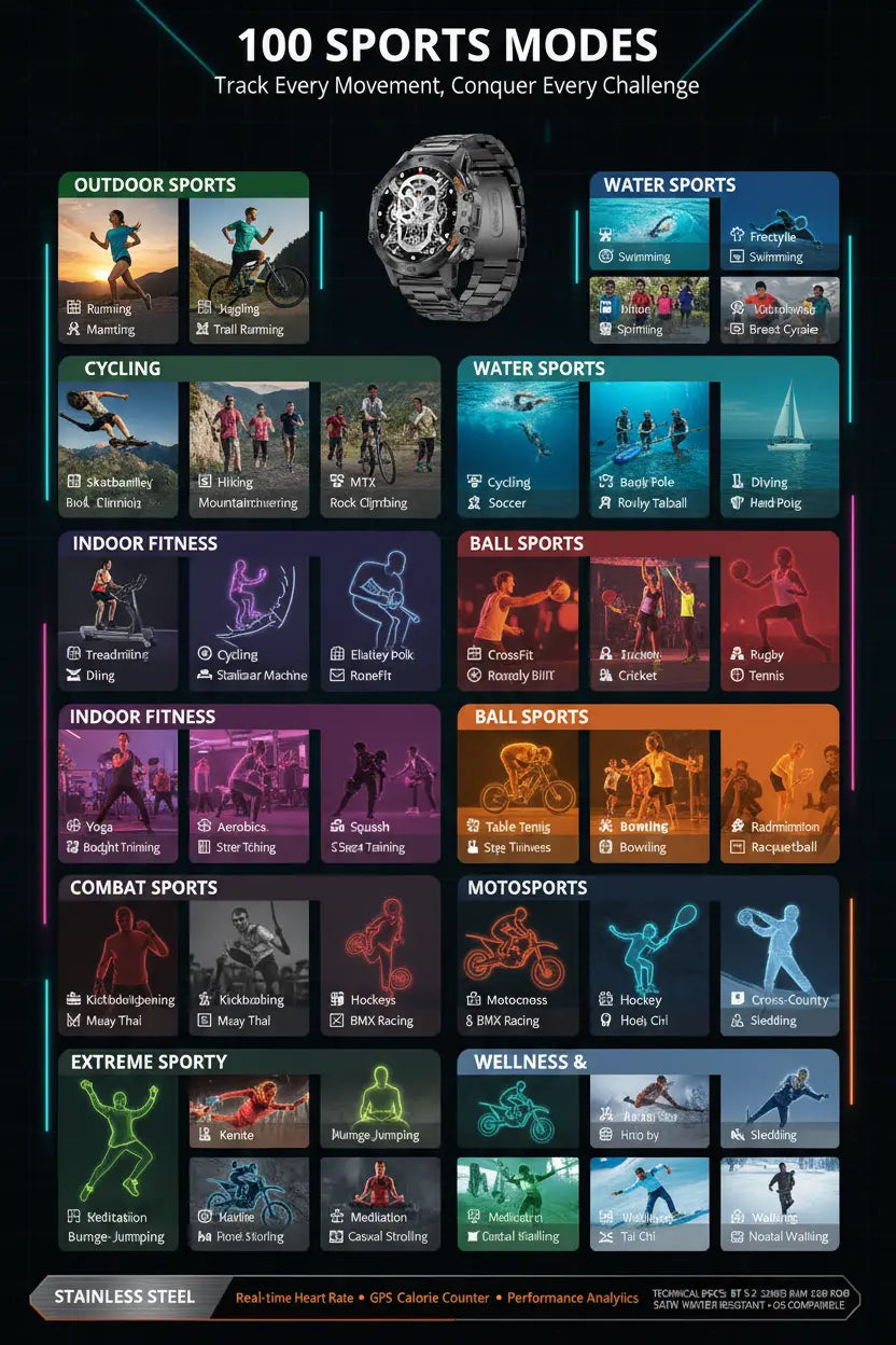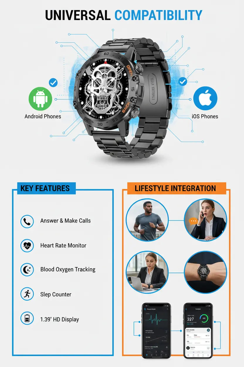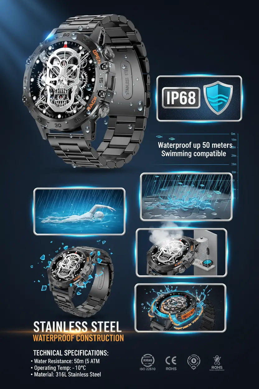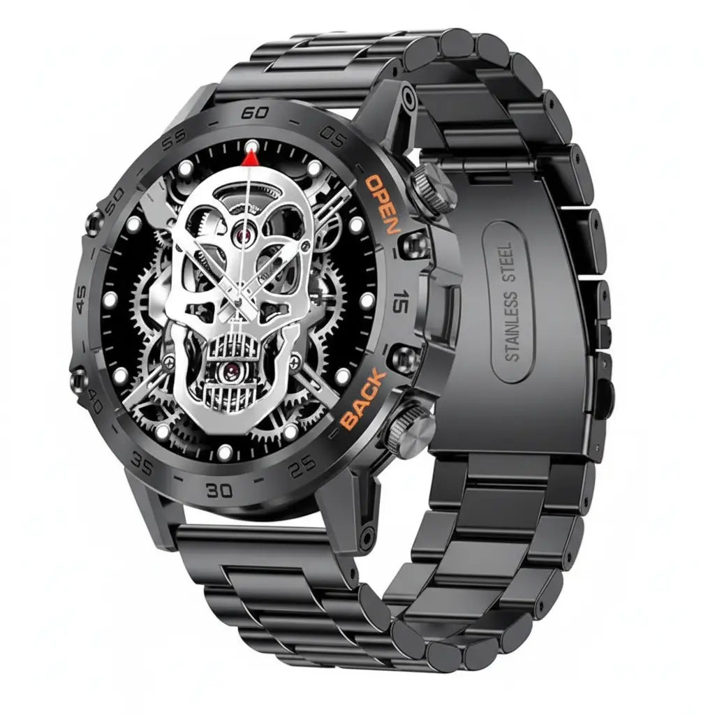 ["【Powerful Battery Reserve】This military sports smartwatch boasts a robust 400mAh battery capacity providing up to 30 days of standby time and 7-10 days of normal operation. The smartwatchs aluminum alloy casing has undergone various military-grade tests for extreme temperatures low pressure dust resistance and more ensuring reliable operation in the harshest environments. Its unquestionably your best companion for short outdoor activities and adventures." 【Advanced Touch and Stunning Visuals】This military smartwatch features a 1.4-inch display with a high resolution of 360x360 delivering a smooth operation and a clearer brighter and more detailed visual experience. The package includes comprehensive instructions to help you operate the smartwatch with ease. Two strap options are available with a standard strap width of 22mm. "【Multifunctional Communication】This Android smartwatch is equipped with a 5.0 Bluetooth chip and a high-quality speaker allowing you to directly answer and make calls read messages play music store contact information and view call records on the mens smartwatch. No need to frequently take out your phone; you wont miss any important information and your hands will no longer be tied." "【Leading a Healthy Lifestyle】This military mens smartwatch leads the trend of a healthy lifestyle offering over 100 sports modes and detailed recording of essential data such as heart rate calories and step count providing robust support for every activity. The mens smartwatch also continuously monitors heart rate blood pressure blood oxygen and sleep comprehensively focusing on your physical condition to help you maintain a healthy state." 【Broad Compatibility and Multifunction】The smartwatch for men is compatible with most phones (Android 4.4 and higher versions and iOS 8.0 or higher). It also offers functions such as weather forecasts alarms timers and more for your convenience. Moreover it provides a selection of over 100 watch faces and you can even upload your favorite photos as a watch face expressing your personality and fashion or sharing your precious memories with your loved ones.]