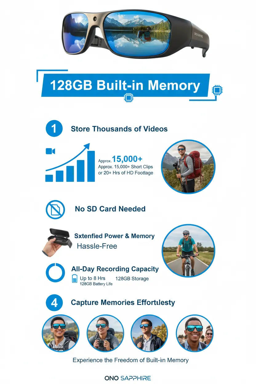 OhO smart glasses come with a generous 128GB built-in memory, allowing you to store a substantial amount of video and photo content without the need for external storage. This feature is particularly advantageous because it provides convenience during trips and outings, so you can focus on enjoying your activities rather than worrying about running out of space. Capture and save your best moments effortlessly!